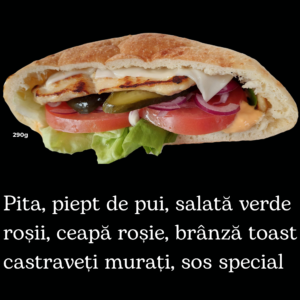 Pita pe vatra, piept de pui la gratar, salată verde, roșii, ceapă roșie, brânză toast, castraveți murați, sos special
